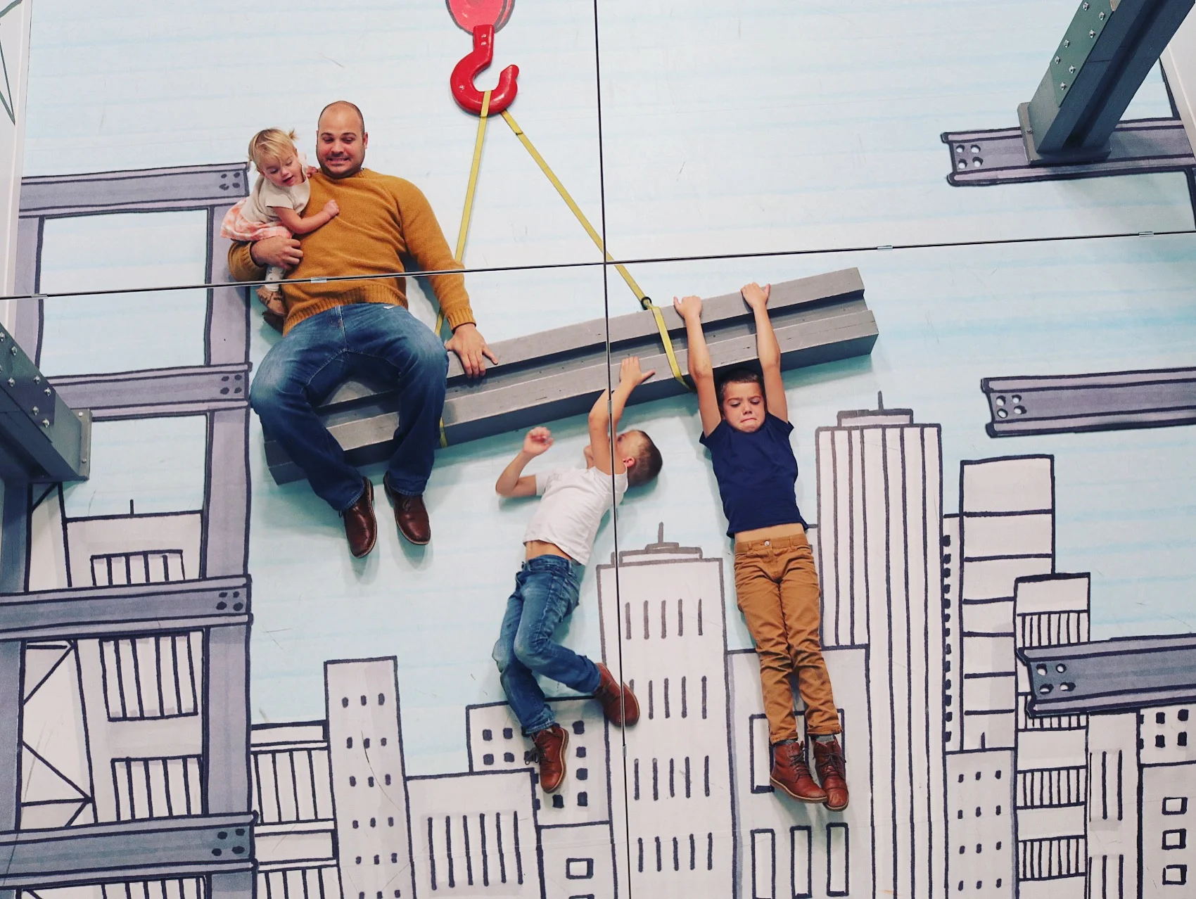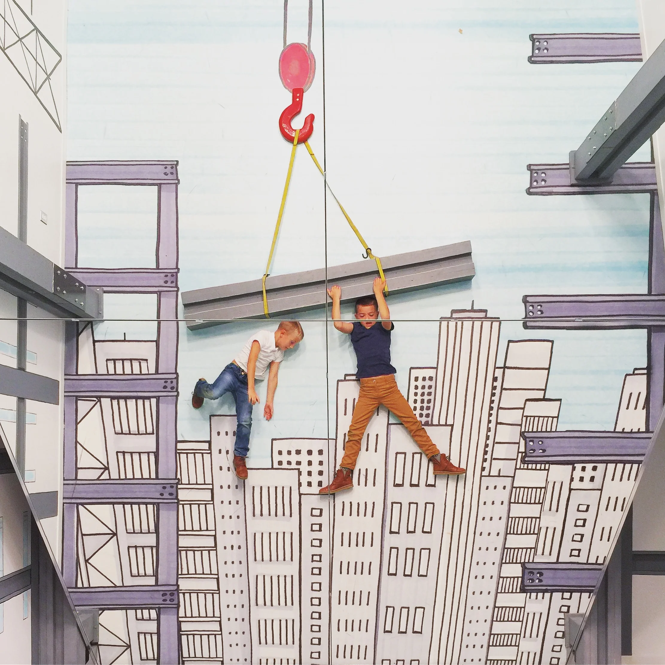 We took the kids to the local childrens museum in Quebec and it was really fun. They had this room filled with mirrors with a city background on the floor. You could lay down on the ground and look at the mirrors giving the illusion that they are hanging from a construction piece. We spent most of our time in this room making different positions.